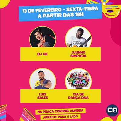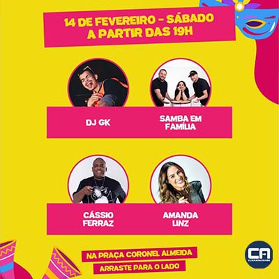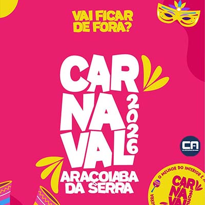 A Prefeitura Municipal de Araçoiaba da Serra divulgou a programação completa do Carnaval 2026, que promete cinco dias de animação para toda a família, de 13 a 17 de fevereiro. A abertura oficial será na sexta-feira (13/02), a partir das 19h, com a apresentação de DJ GK, Julinho Simpatia, Luis Sales e da consagrada Cia de Dança DNA. A festa segue no sábado (14/02), também às 19h, com os shows de DJ GK, Samba em Família, Cássio Ferraz e Amanda Lins. A organização preparou uma estrutura completa no local tradicional da festa, garantindo segurança e entretenimento para foliões de todas as idades.