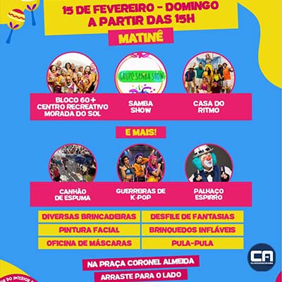 O domingo (15/02) será dedicado às crianças e aos foliões que preferem uma programação diurna. Das 15h às 18h, acontece a matinê infantil, com pocket show das Guerreiras do K-pop e uma série de atividades recreativas: canhão de espuma, pintura facial, oficina de máscaras, desfile de fantasias, brinquedos infláveis e a presença do Palhaço Espirro. Após um intervalo para a missa, a festa retorna às 20h para o público adulto, com a animação do Bloco 60+ Centro Recreativo Morada do Sol, seguido pelo Samba Show e pela Casa do Ritmo.