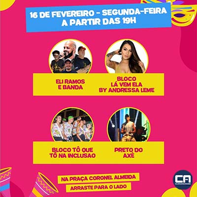 Na segunda-feira de Carnaval (16/02), a folia começa às 19h, dando destaque à inclusão social. A abertura ficará por conta do Bloco Tô que Tô na Inclusão. Em seguida, sobem ao palco Eli Ramos e Banda, Andressa Leme e Banda e a energia contagiante do Preto do Axé. O Palhaço Espirro também integra a programação da noite, garantindo diversão para as crianças que forem ao local.