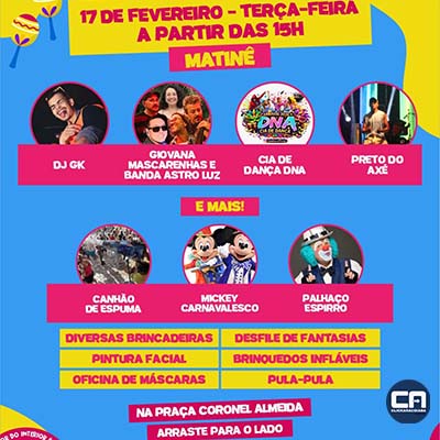 O encerramento, na terça-feira (17/02), promete um grande final. A tarde, a partir das 15h, será mais uma vez das crianças, com o pocket show do Mickey Carnavalesco e toda a estrutura de recreação da matinê. À noite, a festa de despedida começa às 19h, com DJ GK, Giovana Mascarenhas e Banda Astro Luz, o retorno da Cia de Dança DNA e o encerramento com o Preto do Axé. A previsão é que os shows terminem às 20h, fechando com chave de ouro o Carnaval de Araçoiaba da Serra.